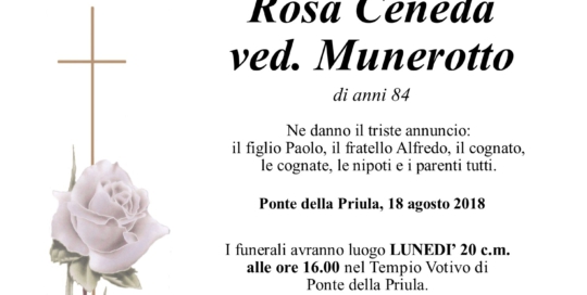 I funerali avranno luogo LUNEDI’ 27 c.m. alle ore 16.00 nella Chiesa Parrocchiale di Susegana. Il Santo Rosario sarà recitato DOMENICA 26 c.m. alle ore 19.00 in Chiesa a Susegana. Si esprime un sentito ringraziamento agli operatori della Casa di Riposo "Opera Immacolata di Lourdes" e al personale sanitario dell'Ospedale di Conegliano.