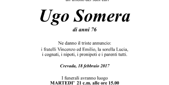 terzariol2017-02-18T09:55:10+01:00I funerali avranno luogo MARTEDI’ 21 c.m. alle ore 15.00 nella Chiesa Parrocchiale di Crevada. Il S.Rosario sarà recitato DOMENICA 19 c.m. alle ore 19.00 in Chiesa a Crevada. Dopo il rito funebre il caro Ugo proseguirà per la cremazione. [...]