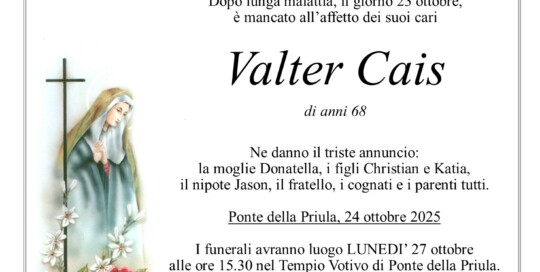 Diego Terzariol2025-10-24T11:11:46+02:00I funerali avranno luogo LUNEDI' 27 ottobre alle ore 15.30 nella Chiesa Parrocchiale di Ponte della Priula. Dopo il rito funebre si proseguirà per la cremazione. Il S. Rosario sarà recitato DOMENICA 26 ottobre alle ore 19.30 nella Chiesa Parrocchiale di Ponte della Priula. ORDINA FIORI Ordina i tuoi fiori [...]