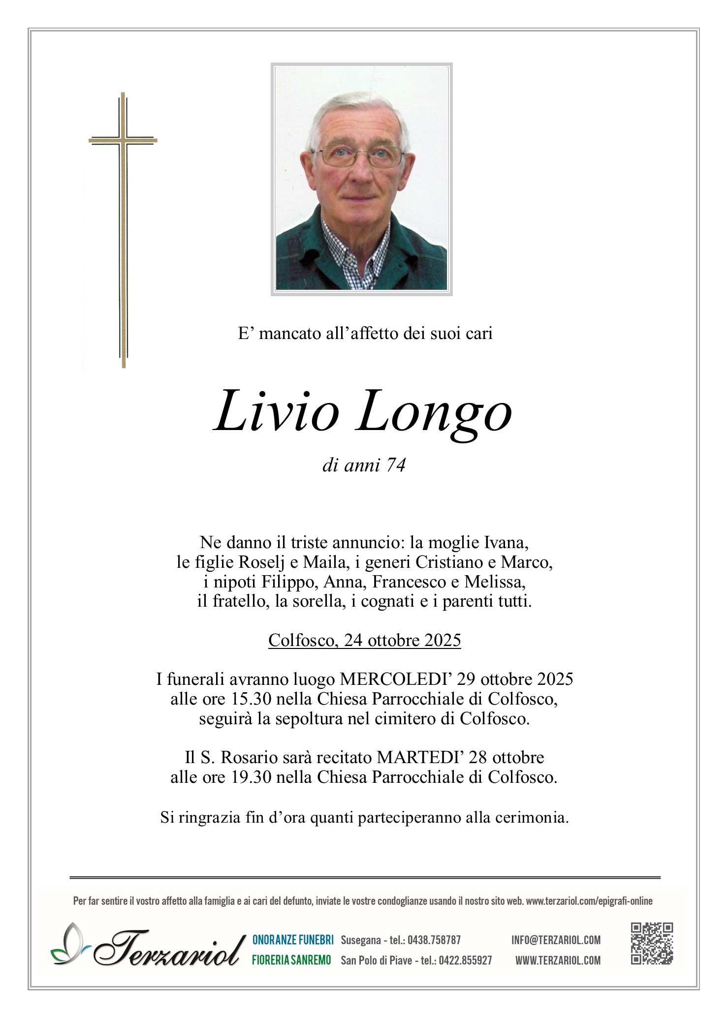 Diego Terzariol2025-10-13T11:22:35+02:00I funerali avranno luogo MERCOLEDI' 15 ottobre alle ore 15.30 nella Chiesa di Susegana. Il Rosario sarà recitato Martedì 14 ottobre alle ore 19.30 in chiesa a Susegana. ORDINA FIORI Ordina i tuoi fiori
