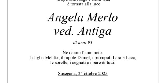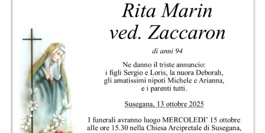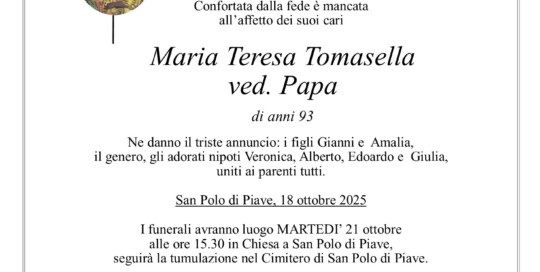 Diego Terzariol2025-10-18T11:12:46+02:00I funerali avranno luogo MARTEDI’ 21 ottobre alle ore 15.30 in chiesa a San Polo di Piave, seguirà la sepoltura nel cimitero di San Polo di Piave. Il Santo Rosario sarà recitato LUNEDI' 20 ottobre alle ore 19.30 in chiesa a San Polo di Piave. Potete far visita alla cara Maria Teresa in Casa [...]