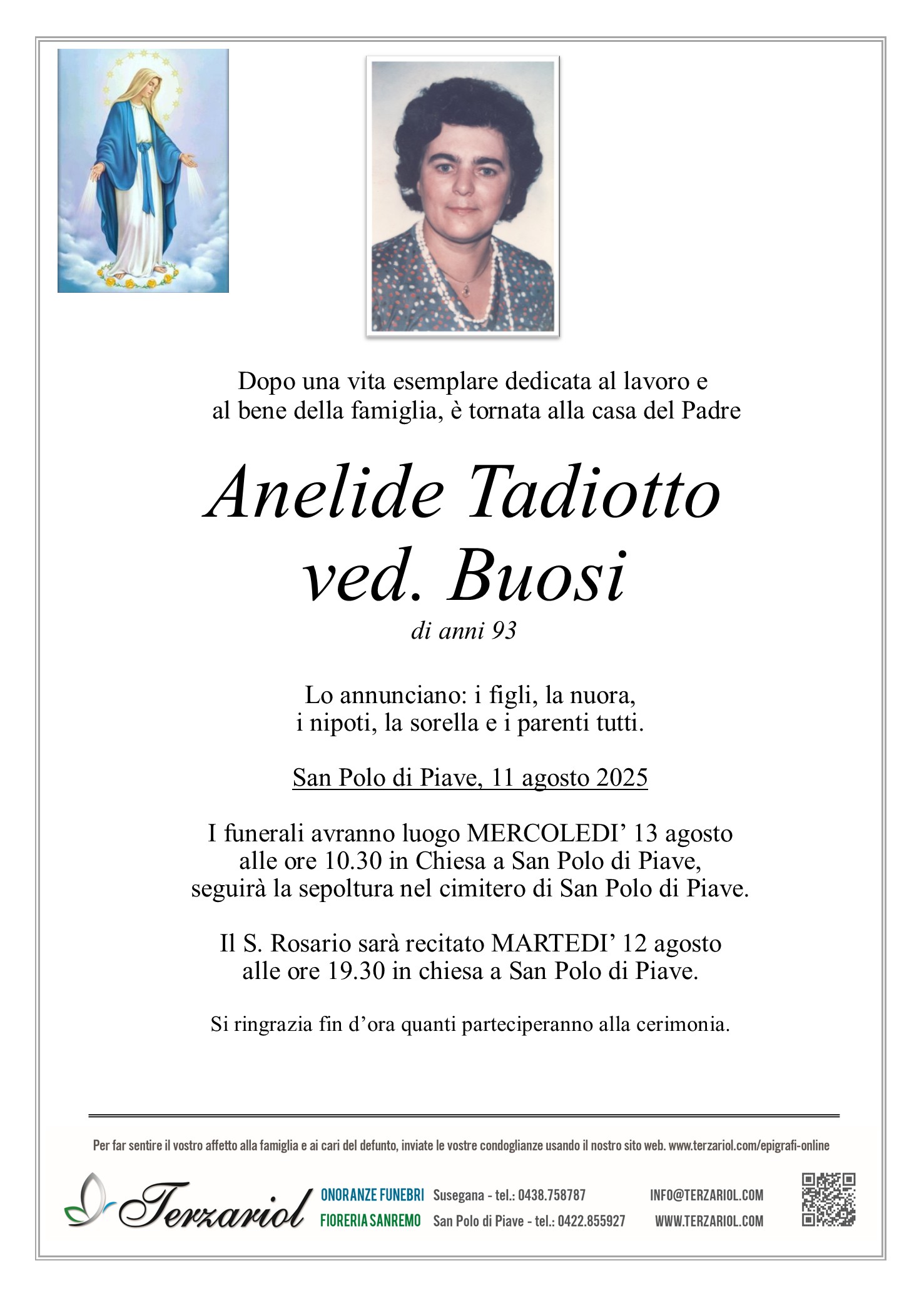 I funerali avranno luogo MERCOLEDI’ 13 agosto alle ore 10.30 nella Chiesa parrocchiale di San Polo di Piave, seguirà la sepoltura nel Cimitero di San Polo di Piave.